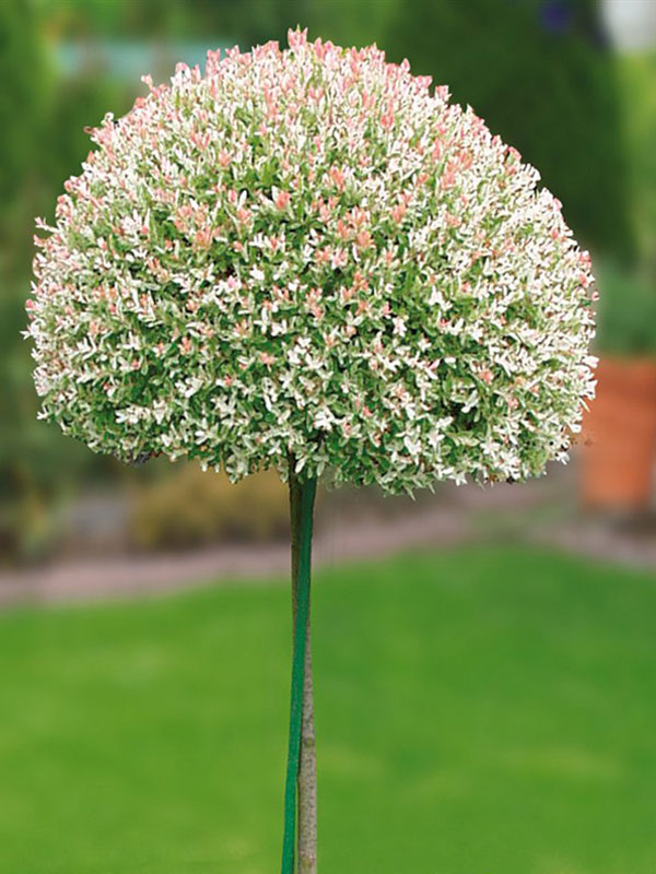 Компактный куст с бело-зеленой листвой и изящными тонкими ветвями.